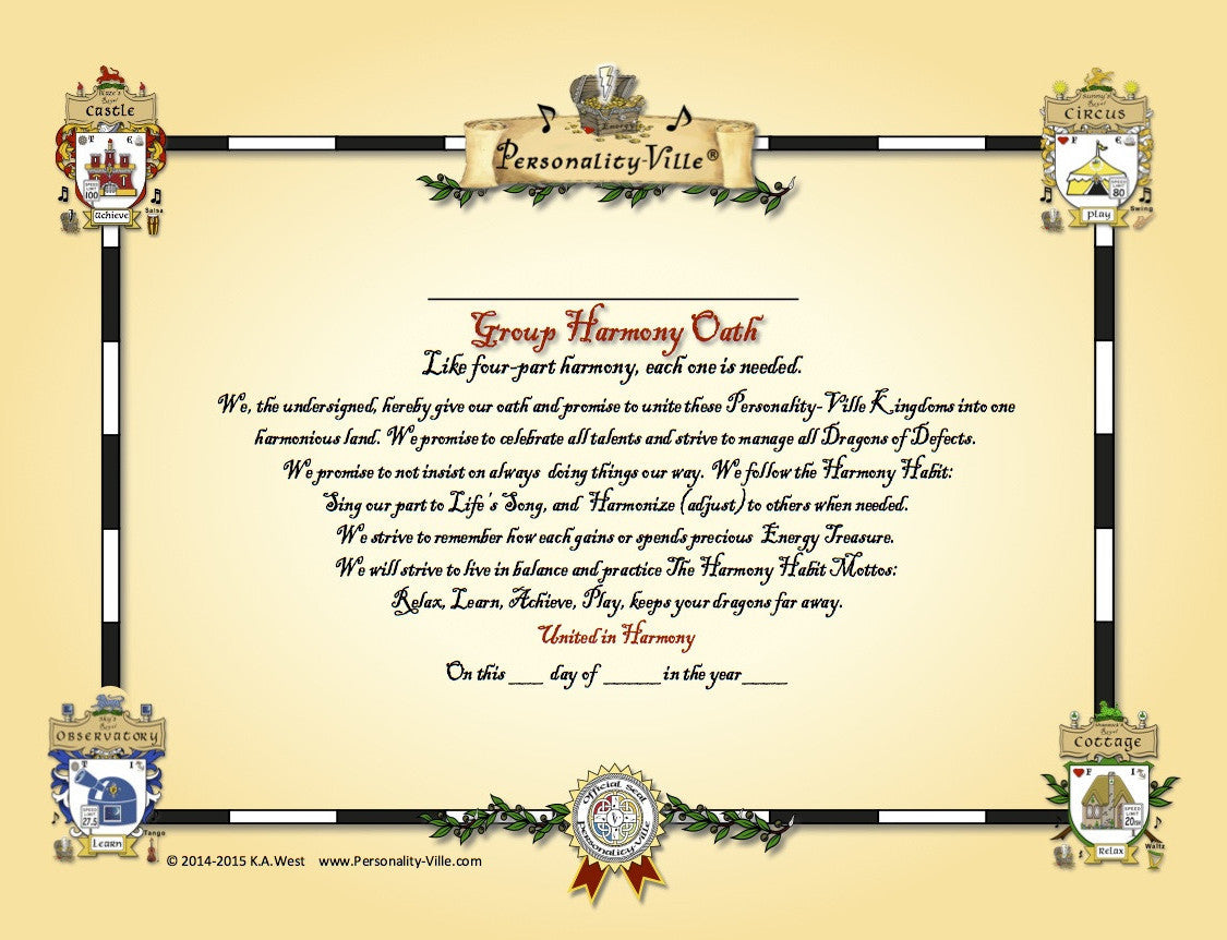We, the undersigned, hereby give our oath and promise to unite these Personality-Ville Kingdoms into one harmonious land. We promise to celebrate all talents and strive to manage all Dragons of Defects.