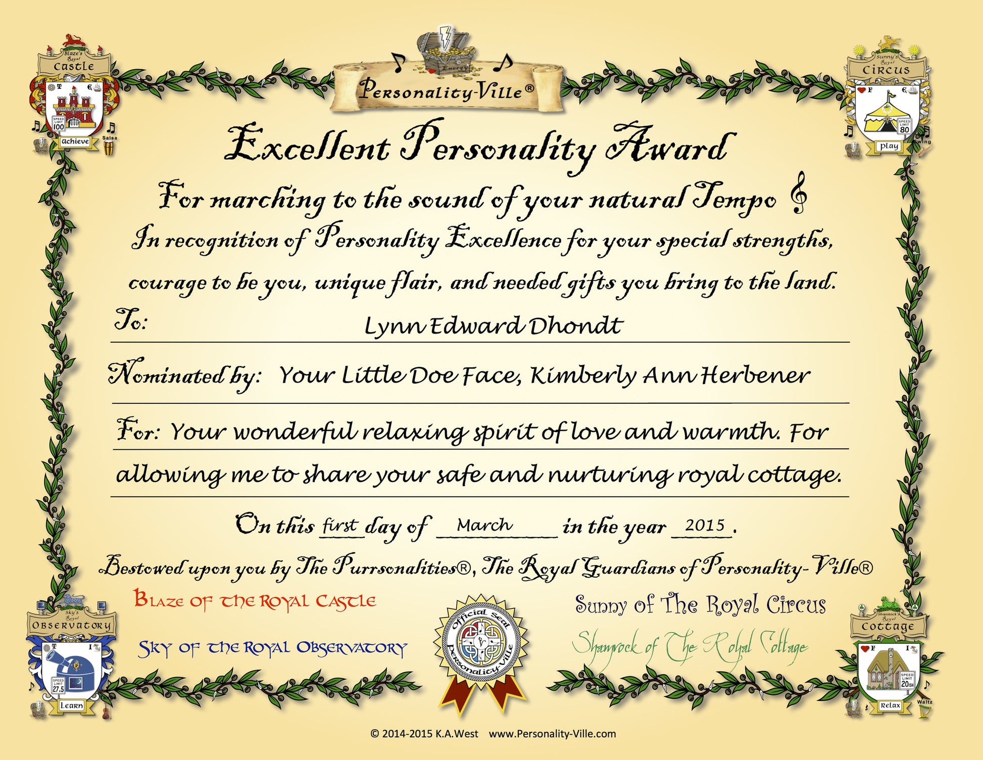 Award Certificate "Excellent Personality" Personalized 8" x 10"